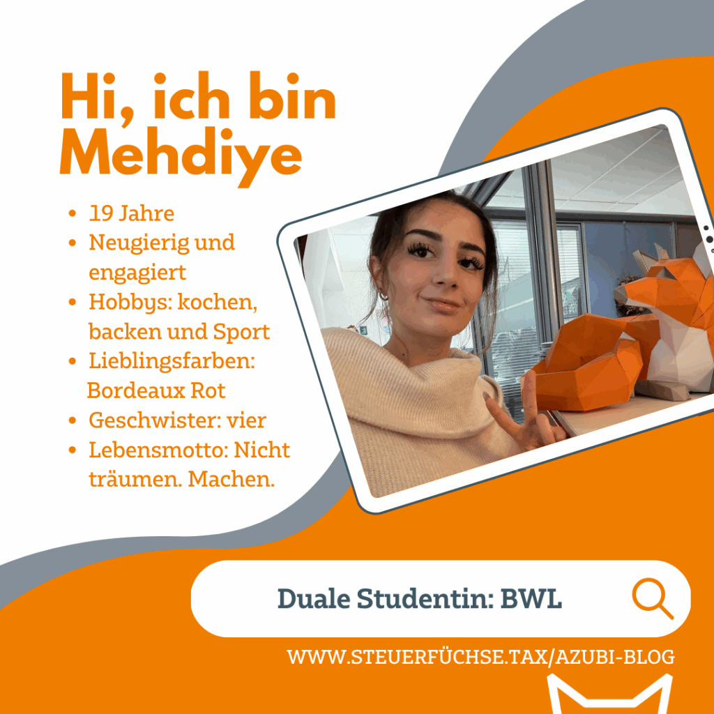 Mein Name ist Mehdiye – oder einfach Mimi. Ich bin 19 Jahre alt und seit dem 1. Oktober 2025 Duale Studentin bei der Steuerberatung Voß – Die Steuerfüchse. Bereits seit Juli bin ich Teil des Rudels – zunächst als Minijobberin, um die Kanzlei, die Abläufe und das Team schon vor dem offiziellen Start kennenzulernen. Diese Zeit hat mir gezeigt: Hier bin ich genau richtig.